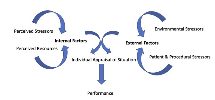 Surgeons may undergo a significant stress response whilst operating associated with decreased technical and non-technical performance, with potential detriment to patient outcomes. This stress response is related to both external factors, such as environmental and procedural stressors, and internal factors, such as the individual’s ability to manage their perception of the situation. These findings are most acutely demonstrated amongst junior and trainee surgeons.