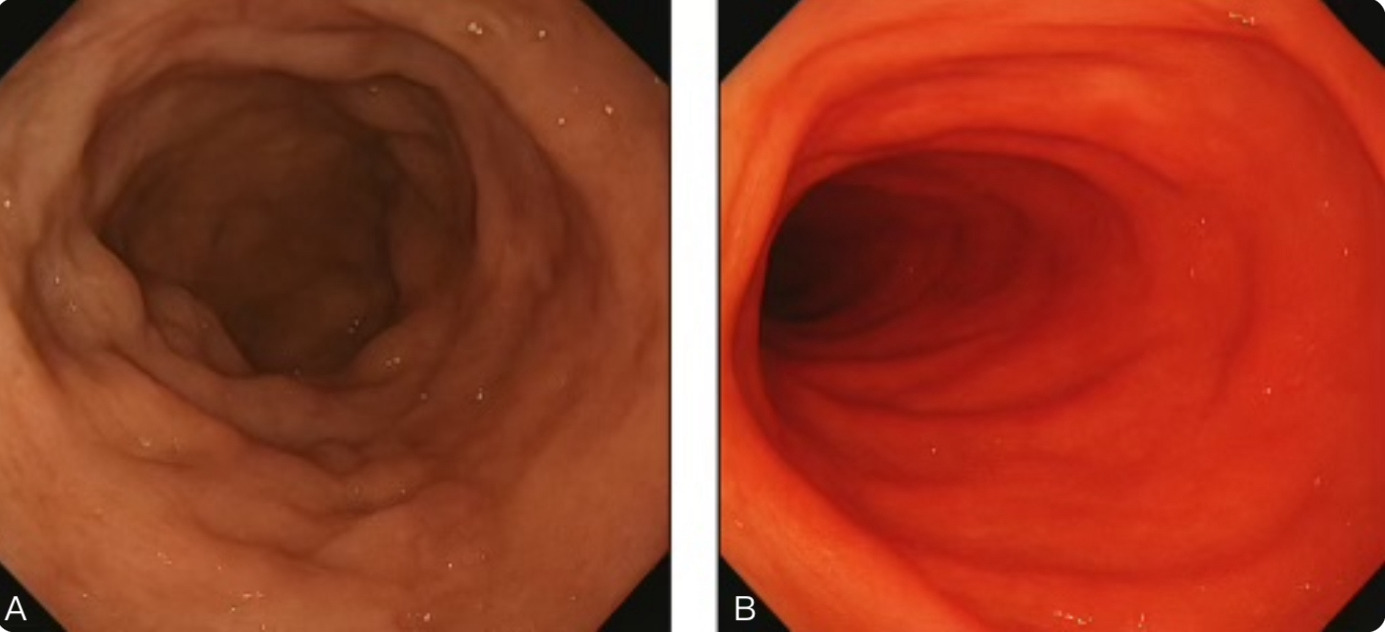 Endoscopic images during the procedure revealed that the duodenal mucosa appeared normal preceding the hydrothermal ablation, but with subtle irregularities consistent with T2DM-related mucosal changes. Following circumferential hydrothermal ablation, the treated segment showed a uniform, erythematous appearance, indicating successful mucosal resurfacing (Figure 1). These images visually confirm the extent and completeness of the DMR procedure.