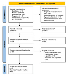 PRISMA 2020 study selection. We identified 6,457 records from MEDLINE (1,377), Embase (4,199), ClinicalTrials.gov (614), and WHO ICTRP (267). After removing 2,036 duplicates, 4,421 titles/abstracts were screened. Fourteen full texts were reviewed; nine were excluded (wrong intervention, n=3; inappropriate population, n=2; outcomes not reported, n=4). Five studies met criteria and were included in the synthesis.