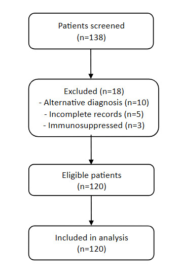 A retrospective cohort study was conducted on 120 patients admitted with lower limb cellulitis over a period of 6 months (February 2025 to July 2025) to a surgical unit of the National Hospital of Sri Lanka which is the largest tertiary care hospital of the country.