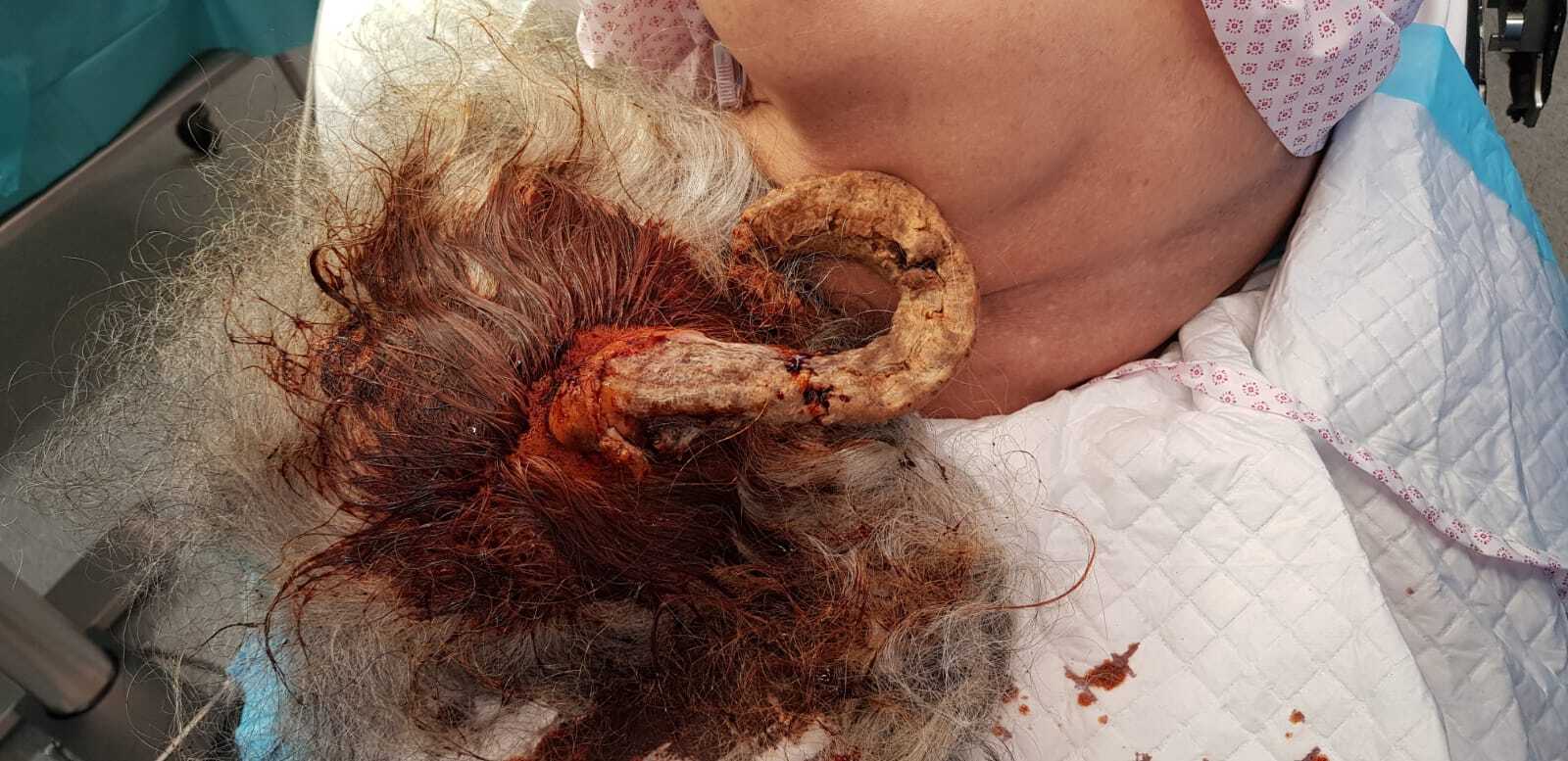 A 75-year-old woman presented to Al Ahli Hospital’s surgery clinic with a painless lesion on the back of her head that had been growing for years. The lesion has grown faster lately, annoying her while lying down and sleeping. The patient is a non-smoker. She had a history of recurrent stasis ulcers on both legs. She had no known drug allergy. Her family history did not include any relevant genetic information or psychosocial history. The physical examination showed a big coiled horn in her occipital area, which measured about 25 centimetres (Fig.1). A Computed tomography (CT) scan revealed a large soft tissue mass arising in the occipital area to the right of the midline with calcification but no bony attachments. The base of the horn is shorter than its length (Fig.2).