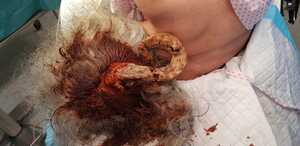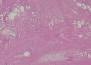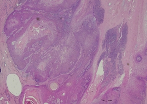Complete excision of the horn was done with V-Y plasty, and the tissue was sent for pathological examination. A coiled horn measuring 26 cm with an attached skin ellipse measuring 4.5 x 3 cm was received in the pathology laboratory. Histopathological examination revealed a well-differentiated squamous cell carcinoma with keratin horn formation (Figs. 3 and 4). The tumour involves the upper dermis only with no vascular or perineural invasion. The lesion was completely excised with clear excision and deep margins measuring > 4mm. The patient’s surgical excision site healed well (Fig. 5), and there were no clinical recurrences over the 5-year period (the patient was seen at 3, 4, and 5 years after excision).