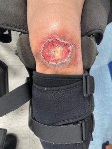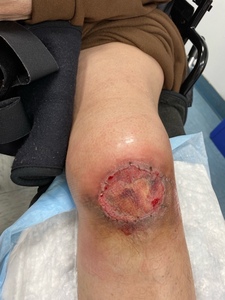 A 53-year-old female presented with a 6.5 x 5 x 0.1 cm non-healing left knee wound, with exposed patella, tendon, and hardware. The wound had persisted for approximately seven months following open reduction and internal fixation of a left patella fracture with patellar tendon repair. Her postoperative course was complicated by a surgical site infection requiring several months of intravenous and oral antibiotics, as well as serial sharp excisional debridements. Although the infection resolved, a chronic wound developed, with skin necrosis, ulceration, and eventual eschar formation (Figure 1).