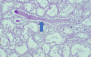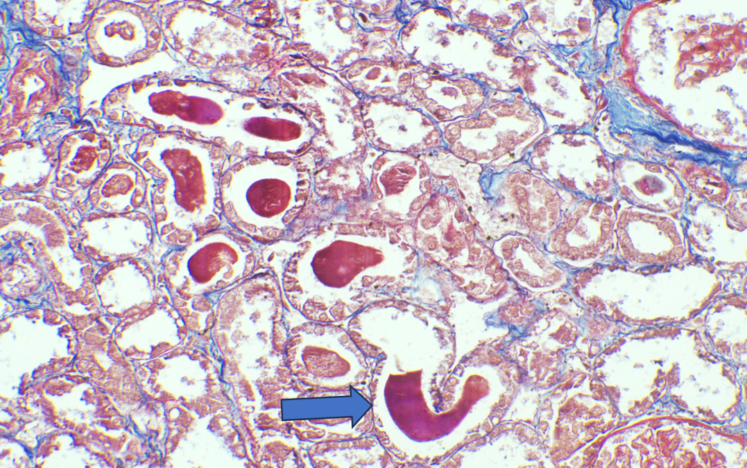 According to one study, other associated finding may be of arterial sclerosis and deposition of calcium oxalate.3 Myoglobin casts are usually appeared eosinophilic to brown granular in H&E stain, are weakly PAS positive and fuchsinophilic in MT stain. Differential diagnosis of Myoglobin casts includes other pigment casts like haemoglobin casts and bile casts.5,11–13