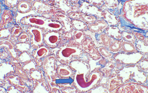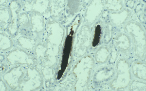 Renal biopsy specimens showing pigment casts on light microscopy, suspicious for myoglobin cast nephropathy.